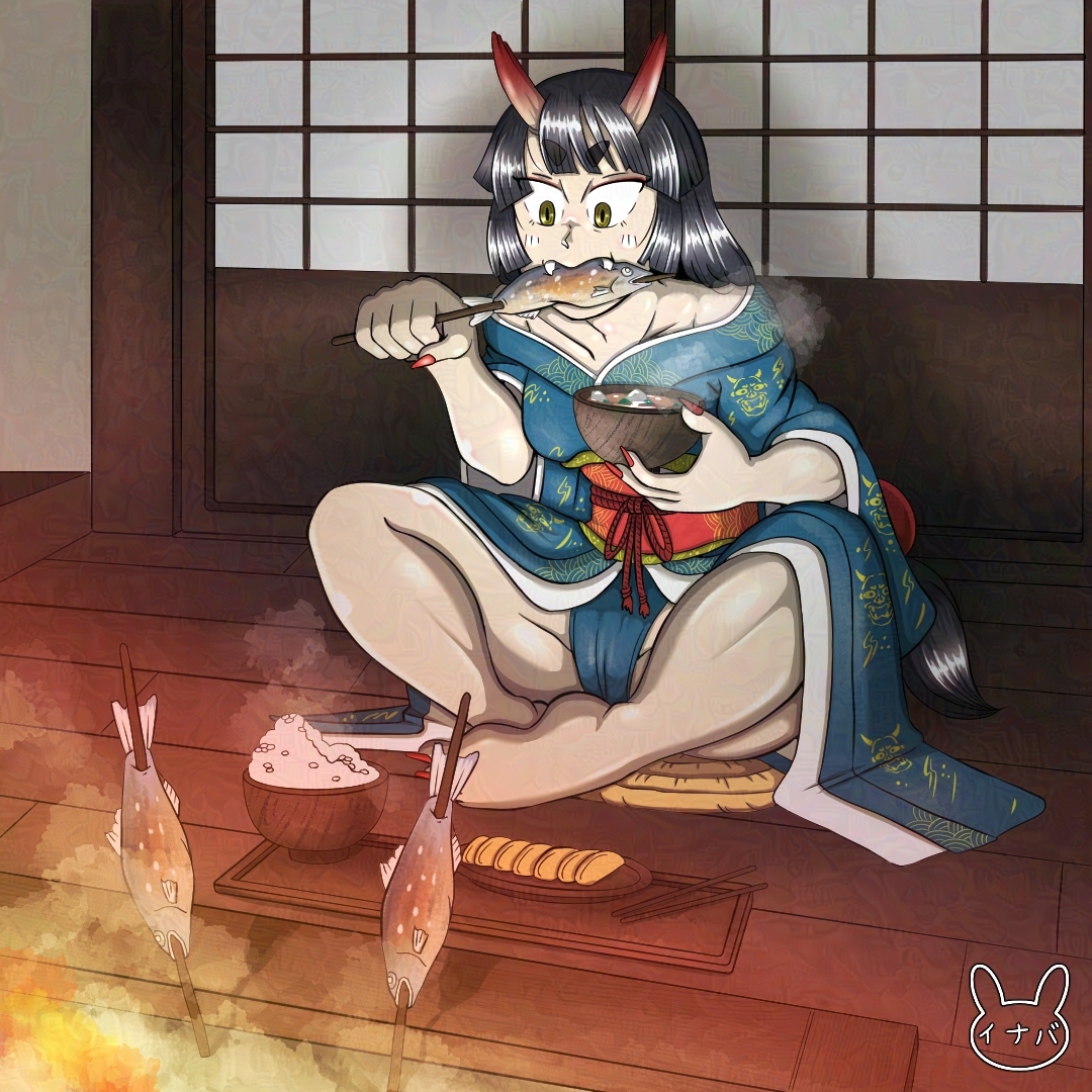 女頭鬼さんの食事風景。炭火でじっくり焼いた鮎の塩焼きは絶品です。