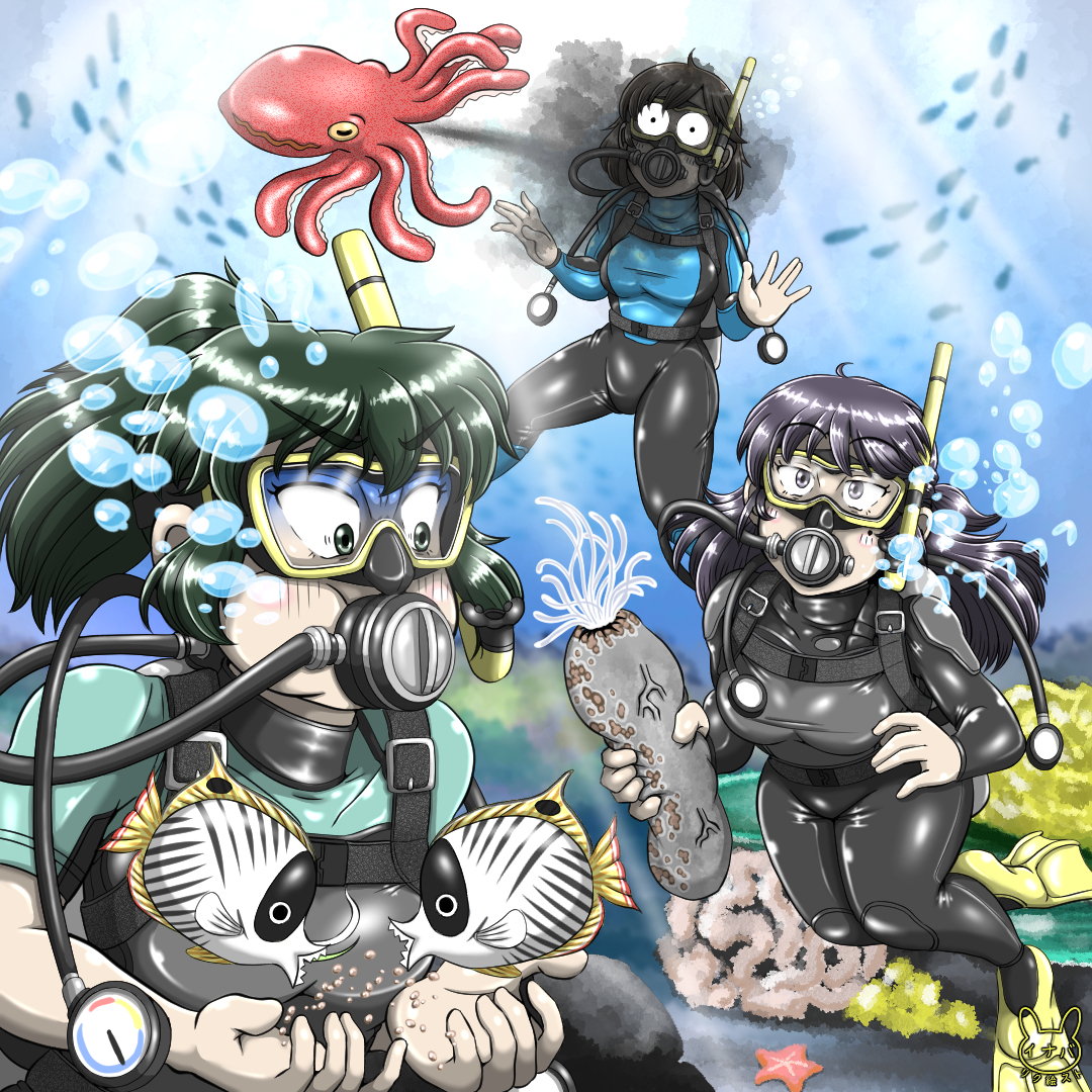 pixiv にてリクエストいただき描いた作品となります。お題は『ダイビングヘルメットを外そうとしている亜子と彩華、その隣で笑っている照子を描いて欲しい。』とのことです。