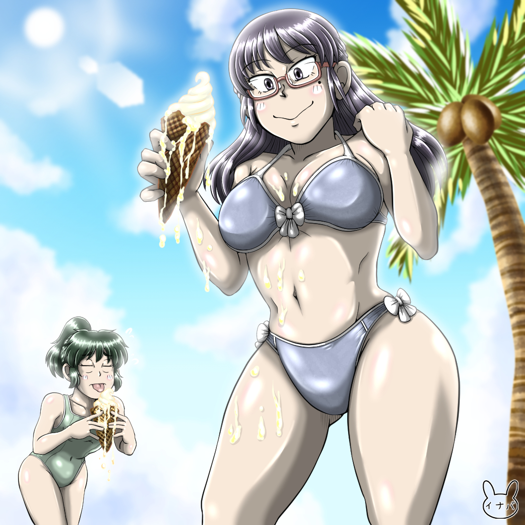 以前に描いたイラストの続編的な内容。たっぷり遊んでプールサイドで休憩中の三人です。